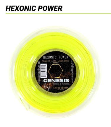 GENESIS HEXONIC POWER 16L OPTIC YELLOW TENNIS STRING USES A HEXAGONAL SHAPE TO DELIVER PLENTY OF ROTATION ON BASELINE DRIVES.